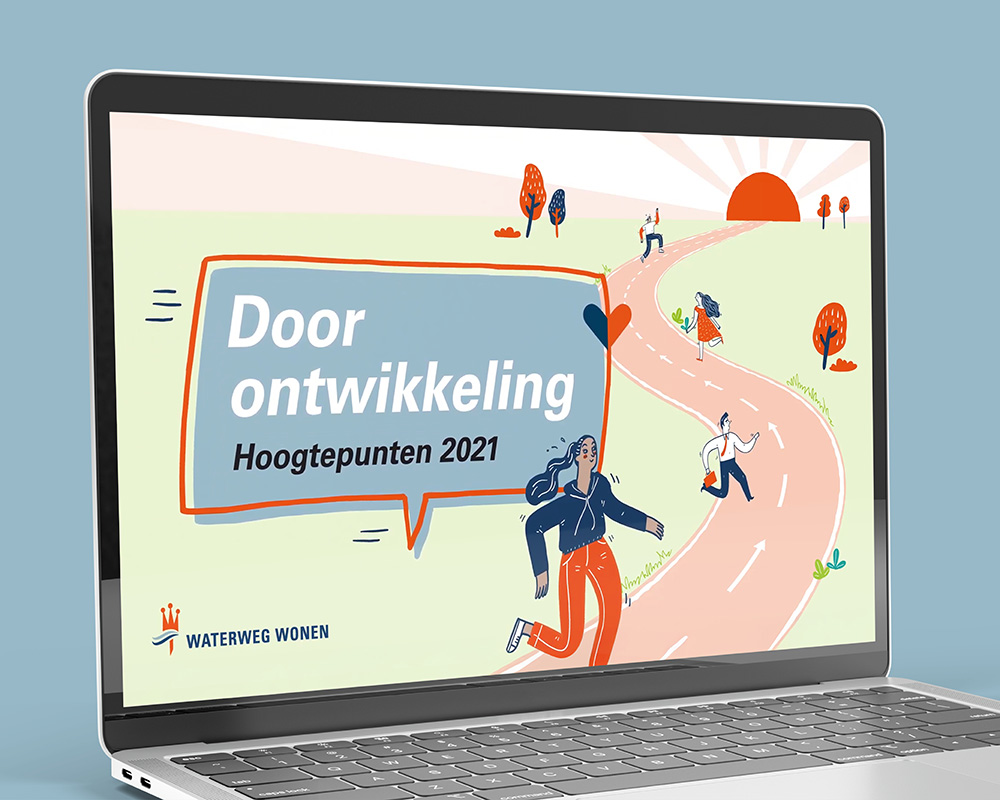 Voor het jaarverslag van Waterweg Wonen 2021 ontwikkelde ik een animatie die de hoogtepunten van het jaar op een dynamische en speelse manier presenteert. De video is onderverdeeld in vier hoofdstukken, die de aandachtsgebieden van Waterweg Wonen zowel als woningcorporatie als werkgever symboliseren. Op basis van het script breidde ik de bestaande illustratiestijl van het jaarverslag uit en vertaalde deze naar animatie. Ik creëerde illustraties voor elk hoofdstuk, bracht beweging aan in de beelden, en koos vrolijke muziek die het succes van het jaar representeert. De animatie blijft trouw aan de stijl van het jaarverslag, maar voegt een energieke dimensie toe.