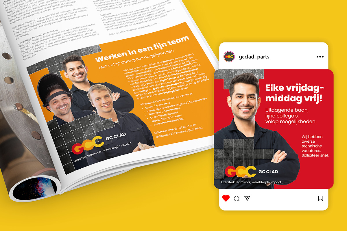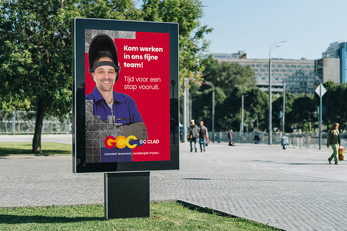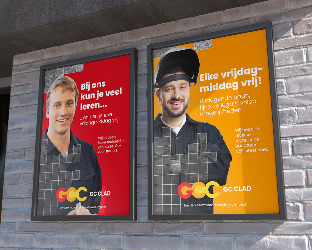 Voor GC Clad ontwikkelde ik een werkgeversidentiteit als onderdeel van een wervingscampagne gericht op het aantrekken van technisch personeel. Op basis van doelgroepanalyse en vooronderzoek ontwierp ik een visuele stijl die werd toegepast op diverse uitingen zoals posters, online- en offline advertenties en snelwegbanieren. De stijl combineert een foto waar een toekomstige werknemer zicht in kan herkennen met een grafisch rasterelement, geïnspireerd op GC Clad’s eigen materiaal ‘Fedur plate’. Deze combinatie zorgde voor een onderscheidende uitstraling die losstaat van de bestaande huisstijl, maar er wel visueel bij aansluit. Door het raster heen komt de persoon subtiel in beeld, waardoor de menselijke kant van het werk en het bedrijf word weergeven.